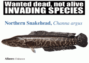 The northern snakehead is an invasive fish native to China, Russia and Korea. Other snakehead species are native to parts of Asia and Africa. Two populations of this air-breathing predator have been identified in New York State; one in two connected ponds in Queens, NYC and one in Ridgebury Lake in the Town of Wawayanda, Orange County. While the Queens population is confined, the Ridgebury population, situated in the Wallkill River drainage, has the potential to infest the entire Hudson River drainage and beyond to the Great Lakes and continental US.
